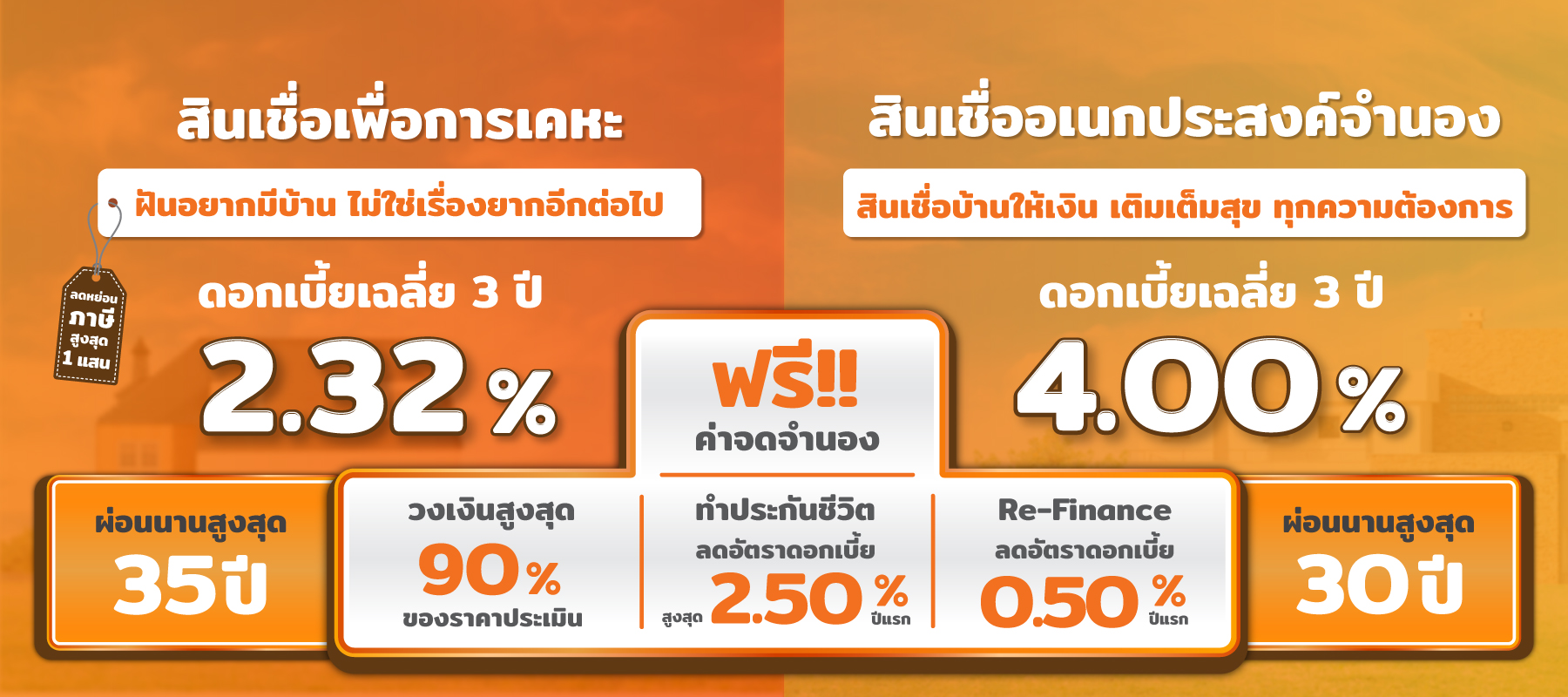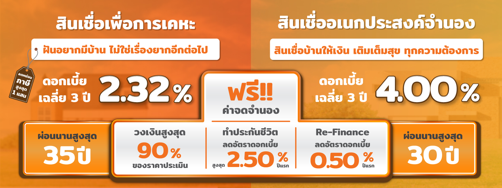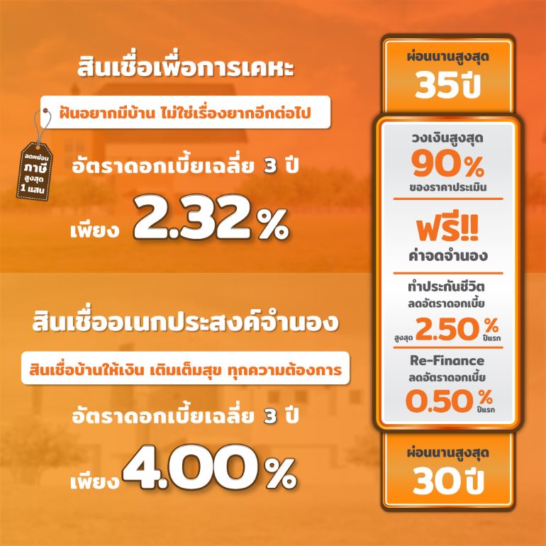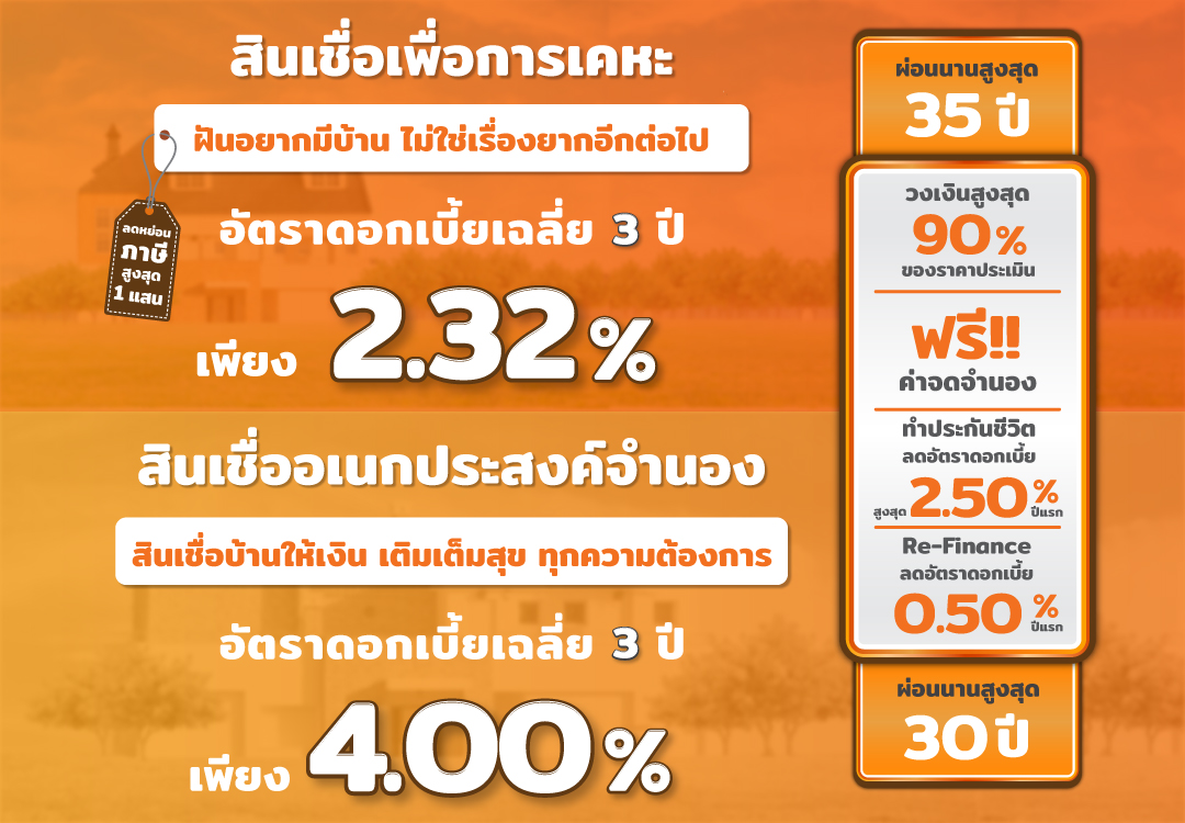 สินเชื่อบ้าน ครบจบในที่เดียว สินเชื่อเพื่อการเคหะ และสินเชื่ออเนกประสงค์จำนอง ให้วงเงินกู้สูงสุดถึง 90% ทำประกันชีวิต ลดดอกเบี้ยปีแรกสูงสุดถึง 2.50% Refinance ลดดอกเบี้ยอีก 0.50%