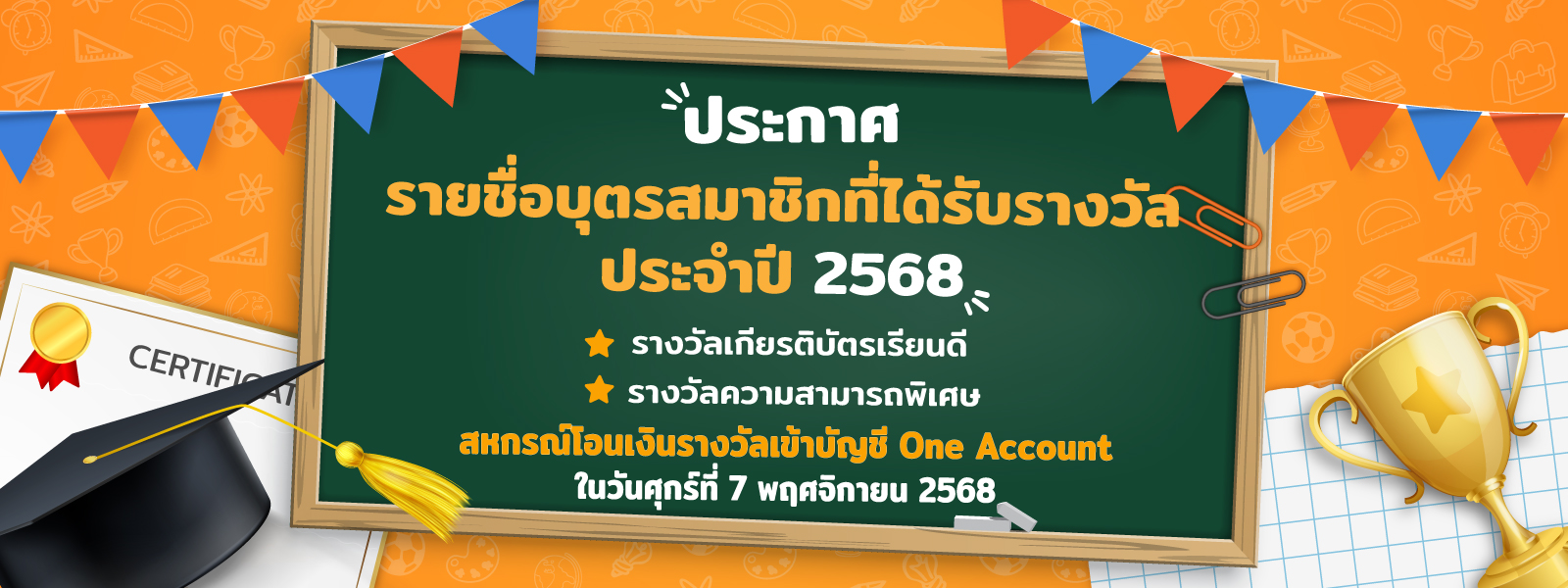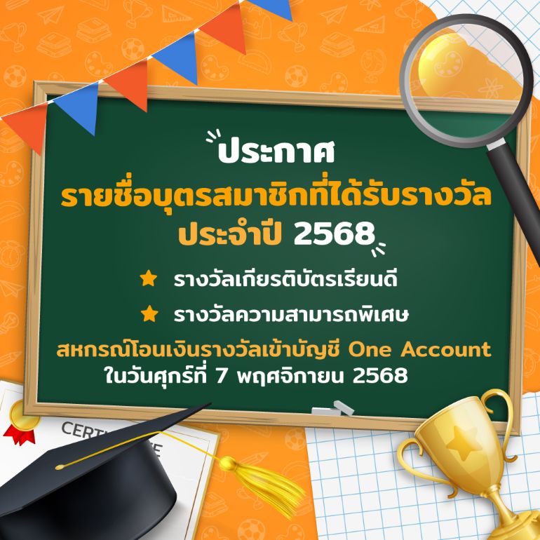 ประกาศรายชื่อบุตรสมาชิกที่ได้รับรางวัลเกียรติบัตรเรียนดี และรางวัลความสามารถพิเศษ ประจำปี 2568 โดยสหกรณ์จะโอนเงินรางวัลเข้าบัญชี ในวันศุกร์ที่ 7 พฤศจิกายน 2568