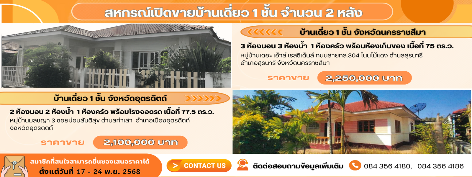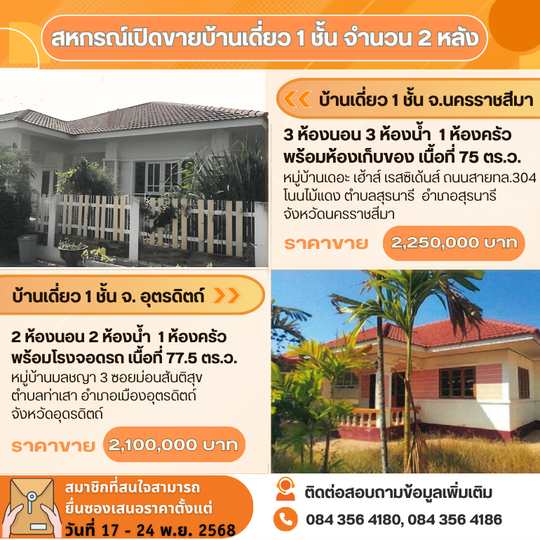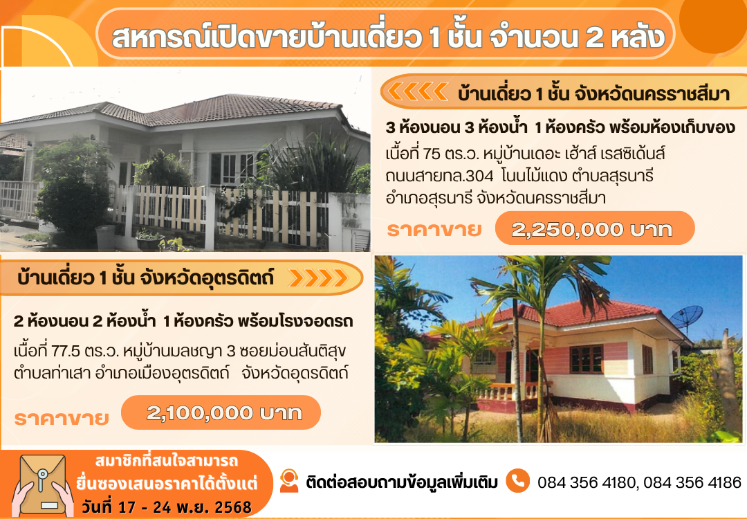 สหกรณ์ธนชาต เปิดขายบ้านเดี่ยว 1 ชั้นจำนวน 2 หลัง โดยยื่นกู้เคหะกับสหกรณ์ได้ 100% สมาชิกสหกรณ์ที่สนใจ สามารถยื่นซองเสนอราคาได้ตั้งแต่วันที่ 17-24 พฤศจิกายน 2568 นี้เท่านั้น