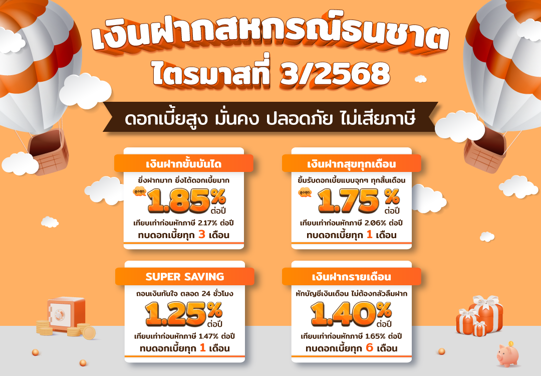 เอาใจผู้รักการออมที่ต้องการผลตอบแทนดอกเบี้ยสูง โดยได้ดอกเบี้ยตามวงเงินฝากที่เพิ่มขึ้นเป็นขั้นบันไดสูงสุด 3 ขั้น ทบต้นดอกเบี้ยให้ทุกไตรมาส เพียงฝากเงินในรอบไตรมาสนี้ภายในวันที่ 1 กรกฏาคม 2568 (โดยโอนผ่าน App ธนาคาร หัวข้อ Bill Payment)