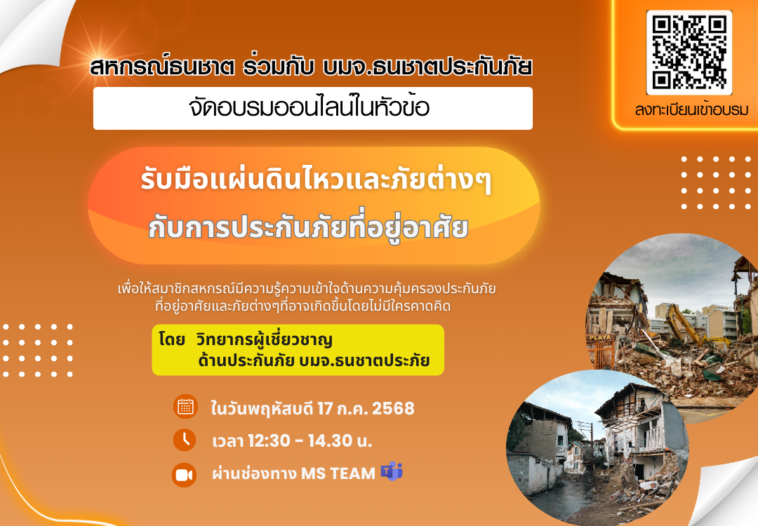สหกรณ์ธนชาต ได้เล็งเห็นความสำคัญในเรื่องนี้ จึงร่วมมือกับทาง บมจ.ธนชาตประกันภัย เชิญชวนสมาชิกทุกท่าน ร่วมอบรมออนไลน์เพื่อเตรียมความพร้อมรับมือกับภัยธรรมชาติ ที่เกิดขึ้นโดยไม่ทั้นตั้งตัว ในวันพฤหัสบดี ที่ 17 กรกฎาคม 2568 เวลา 12.30 – 14.30 น. โดยวิทยากรผู้เชี่ยวชาญด้านประกันภัยจาก บมจ.ธนชาตประกันภัย