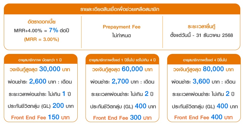 - เงินกู้ครั้งนี้สามารถหักกลบสินเชื่อเพื่อช่วยเหลือสมาชิกเดิม (ถ้ามี) หรือไม่ก็ได้แต่เมื่อรวมกับสินเชื่อประเภทเงินช่วยเหลือสมาชิก ต้องไม่เกิน 2 สัญญา