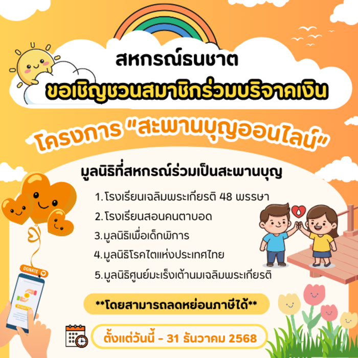 สหกรณ์ธนชาตขอเชิญชวนพี่ๆ เพื่อนๆ สมาชิกทุกท่าน ร่วมบริจาคเงินเพื่อแบ่งปันสิ่งดี ๆ ให้กับสังคม ในโครงการ “สะพานบุญออนไลน์” ตั้งแต่วันนี้ - 31 ธันวาคม 2568