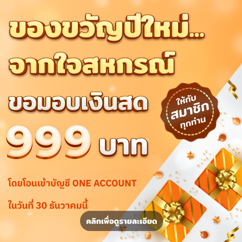 สหกรณ์ธนชาตมอบของขวัญปีใหม่ จำนวน 999 บาท เข้าบัญชี ONE ACCOUNT ของสมาชิก ในวันที่ 30 ธ.ค. 2568