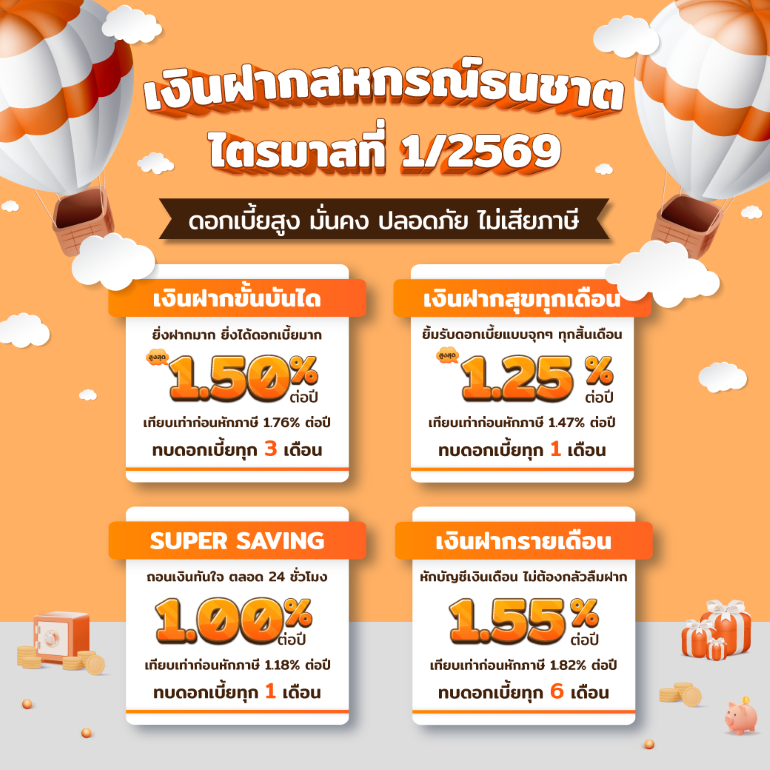 อัตราดอกเบี้ยเงินฝากสหกรณ์ธนชาต ไตรมาสที่ 1/2568 ฝากเงินกับสหกรณ์ ดอกเบี้ยสูง มั่นคง ปลอดภัย ไม่เสียภาษี