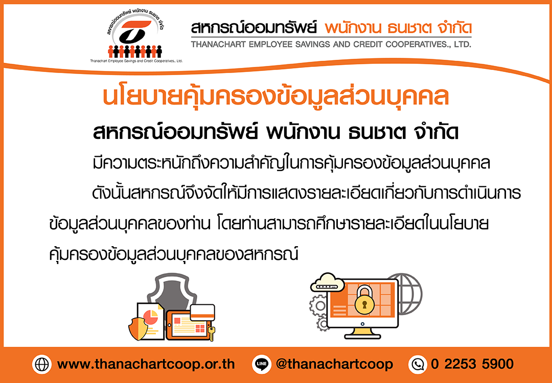 สหกรณ์ออมทรัพย์ พนักงาน ธนชาต จำกัด มีความตระหนักถึงความสำคัญในการคุ้มครองข้อมูลส่วนบุคคล จึงจัดให้มีประกาศความเป็นส่วนตัว เพื่อชี้แจงรายละเอียดเกี่ยวกับการเก็บรวบรวม ใช้ และ/หรือเปิดเผยข้อมูลส่วนบุคคล ระยะเวลาในการจัดเก็บ รวมถึงสิทธิของเจ้าของข้อมูล โดยท่านสามารถศึกษารายละเอียดเพิ่มเติมเกี่ยวกับประกาศนโยบายการคุ้มครองข้อมูลส่วนบุคคลได้ที่ (คลิกที่นี่)