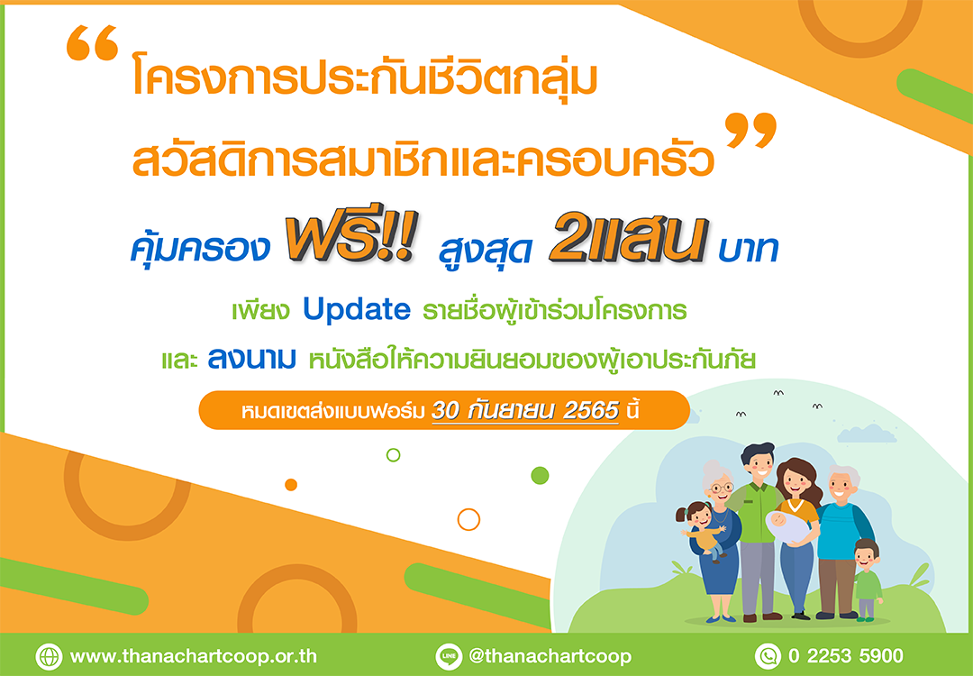 เพียงสมาชิกกรอกข้อมูล แล้วส่งเอกสารของท่านและบุคคลในครอบครัวกลับมาที่สหกรณ์ ภายในวันที่ 30 กันยายน 2565 จะได้รับคุ้มครองการเสียชีวิต ในปี 2565 ทุกกรณี โดยไม่เสียค่าใช้จ่ายใดๆ ตามวงเงินดังนี้