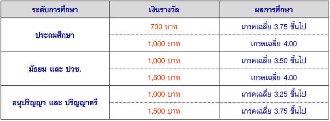 1. รางวัลเกียรติบัตรเรียนดี รับเกียรติบัตรและโอนเงินรางวัลเข้าบัญชีสมาชิก ตามรายละเอียดดังนี้