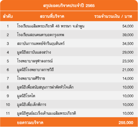 สรุปยอดเงินบริจาคที่มอบให้แต่ละองค์กร ดังนี้