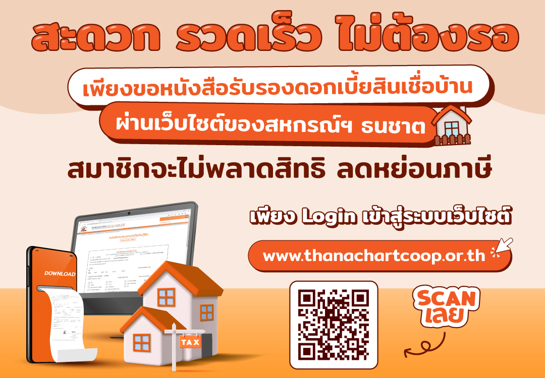 สมาชิกสามารถสั่งพิมพ์หนังสือรับรองดอกเบี้ยสินเชื่อบ้าน ได้ที่ www.thanachartcoop.or.th โดย