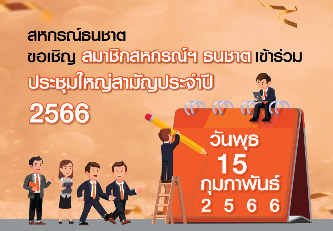 ขอเชิญสมาชิกสหกรณ์ธนชาตทุกท่าน เข้าร่วมประชุมใหญ่สามัญประจำปี 2566 ในวันพุธที่ 15 กุมภาพันธ์ 2566 เพื่อพิจารณาอนุมัติการจ่ายเงินปันผลและแก้ไขข้อบังคับ โดยสหกรณ์จะเปิดให้สมาชิกลงทะเบียนได้ตั้งแต่เวลา 11.15 น. พร้อมกันทั้ง 2 อาคาร ดังนี้