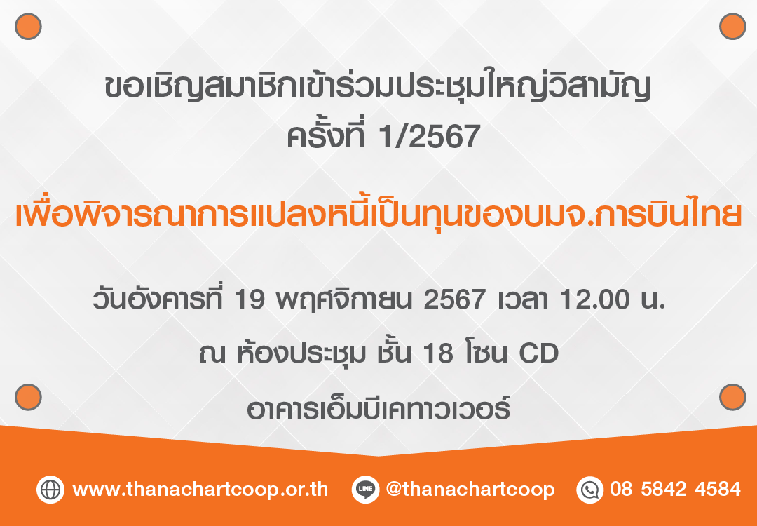 สหกรณ์ออมทรัพย์พนักงานธนชาต ขอเชิญสมาชิกเข้าร่วมประชุมใหญ่วิสามัญ ครั้งที่ 1/2567 ในวันอังคารที่ 19 พฤศจิกายน 2567 เวลา 12.00 น. ณ ห้องประชุม ชั้น 18 โซน CD อาคารเอ็มบีเคทาวเวอร์ เป็นการด่วน เพื่อพิจารณาการแสดงเจตนาแปลงหนี้เป็นทุนของบมจ.การบินไทย ระหว่างวันที่ 19-21 พฤศจิกายน 2567 โดยการประชุมในครั้งนี้ต้องใช้มติจากสมาชิกขั้นต่ำ 100 ท่าน