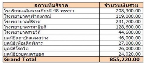 สรุปยอดเงินบริจาคที่มอบให้แต่ละองค์กร