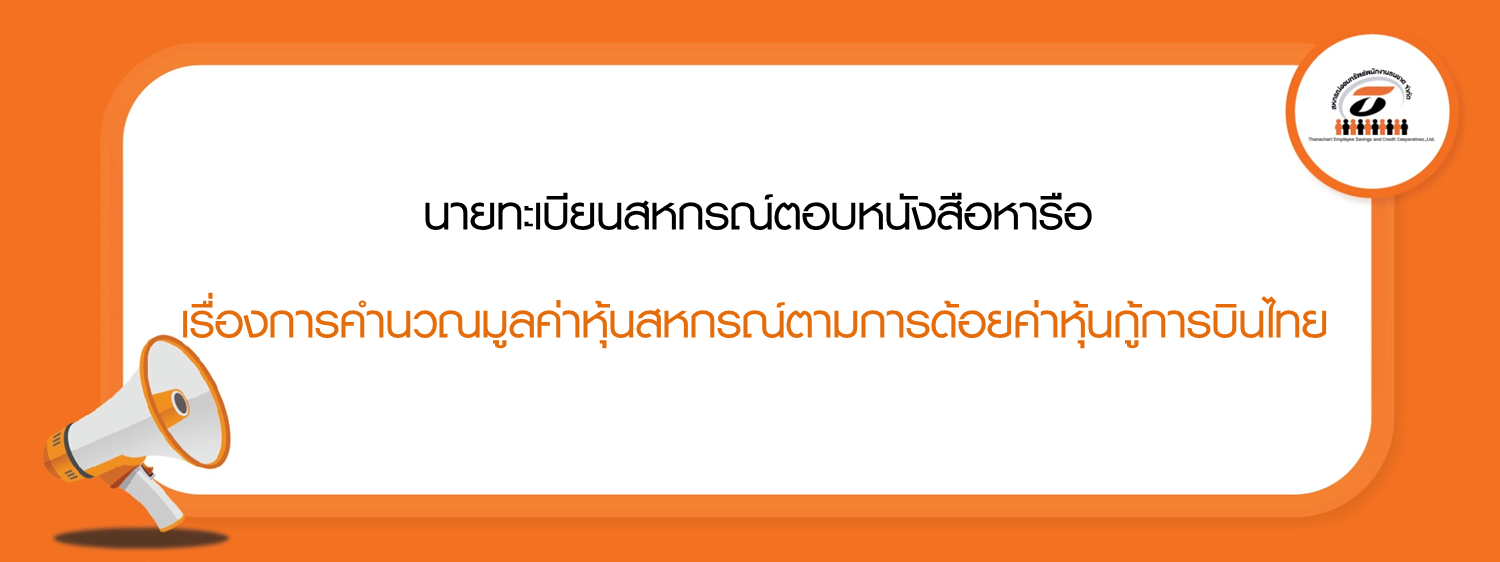 ด้วยเหตุผลดังกล่าว นายทะเบียนสหกรณ์จึงไม่เห็นชอบในวิธีการคำนวณมูลค่าหุ้นปัจจุบันของสหกรณ์ตามการด้อยค่าของเงินลงทุนในหุ้นกู้บมจ.การบินไทย ด้วยวิธีการ Set Aside ตามที่ที่ประชุมใหญ่วิสามัญ ครั้งที่ 1/2563 ของสหกรณ์ได้มีมติให้ความเห็นชอบ ดังนั้น มูลค่าหุ้นของสหกรณ์ ณ ปัจจุบัน ยังคงมีมูลค่าหุ้นละ 10 บาท ตามที่ข้อบังคับกำหนด และการจ่ายเงินปันผลประจำปีสามารถกระทำได้หากสหกรณ์มีกำไรสุทธิตามผลประกอบการที่เกิดขึ้นจริง ทั้งนี้ คณะกรรมการดำเนินการจะได้นำคำแนะนำของนายทะเบียนสหกรณ์ไปพิจารณาดำเนินการตามความเหมาะสม เพื่อรักษาผลประโยชน์สูงสุดของสมาชิกเป็นสำคัญ