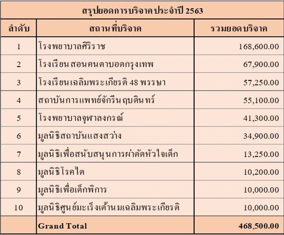 สรุปยอดเงินบริจาคที่มอบให้แต่ละองค์กร