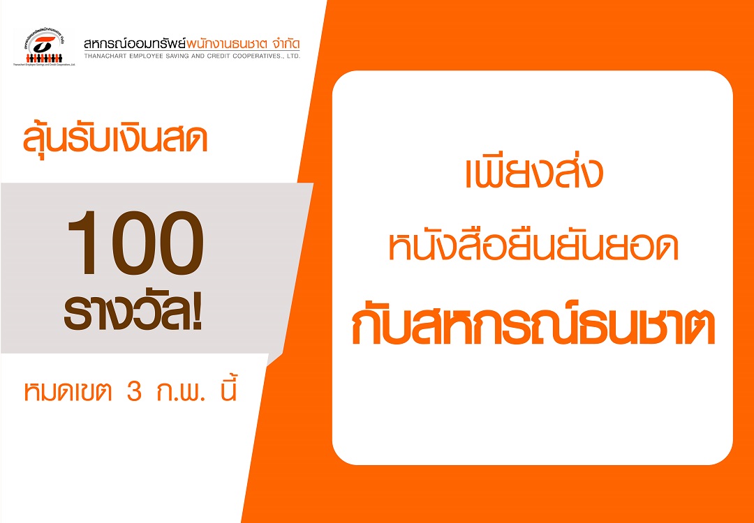 สหกรณ์ธนชาต ชวนสมาชิกร่วมลุ้นรางวัลเงินสด เพียงส่งหนังสือยืนยันยอด ภายในวันที่ 3 กุมภาพันธ์ 2564