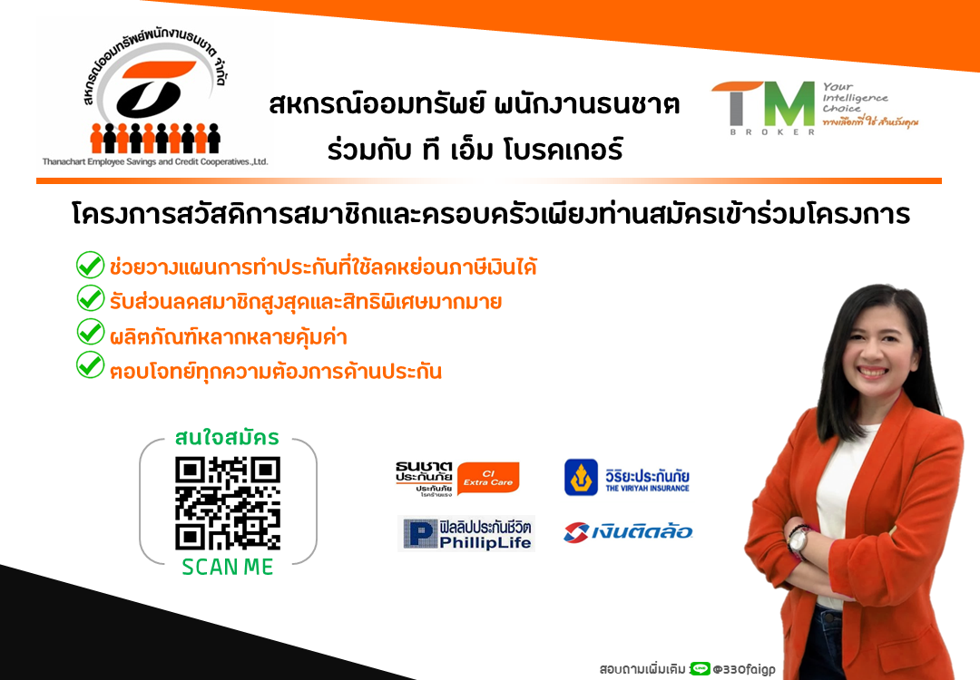 โดย “ประกัน” เป็นอีกหนึ่งตัวช่วยในการลดหย่อนภาษีที่หลายคนเลือกใช้ แต่จะเลือก “ประกัน” อย่างไรให้เหมาะกับตัวเอง พร้อมทั้งได้ประโยชน์ในการลดหย่อนภาษี และประโยชน์จากการคุ้มครองในเวลาเดียวกัน พิเศษสุดกับโปรโมชั่นสำหรับสมาชิกสหกรณ์ฯเท่านั้น เมื่อซื้อประกันครบ 50,000 บาทขึ้นไป รับกระเป๋าเดินทางฟรี!! โดยทาง TM Broker ได้คัดสรรผลิตภัณฑ์ที่มีความแตกต่าง ตอบโจทย์ท่านสมาชิกที่กำลังมองหาประกันภัย อาทิเช่น
