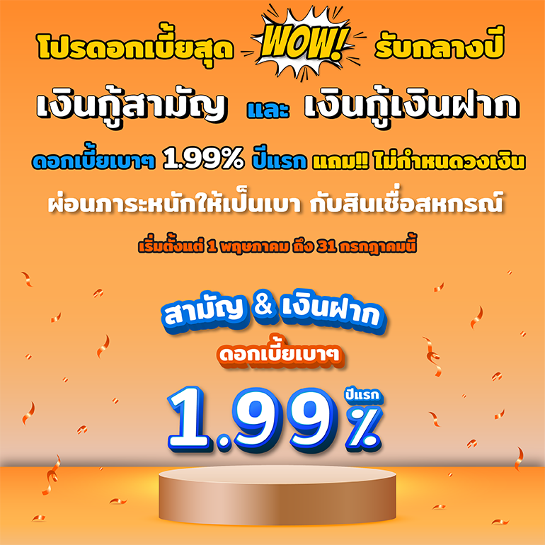 โปรโมชัน เงินกู้สามัญและ เงินกู้เงินฝาก ดอกเบี้ยสุด WOW! ผ่อนภาระหนักให้เป็นเบา ด้วยดอกเบี้ยเบาๆ เพียง 1.99% ปีแรก ผ่อนสบายๆ ได้สูงสุด 15 ปี แถม!! ไม่กำหนดวงเงิน หมดเขต 31 กรกฎาคมนี้เท่านั้น
