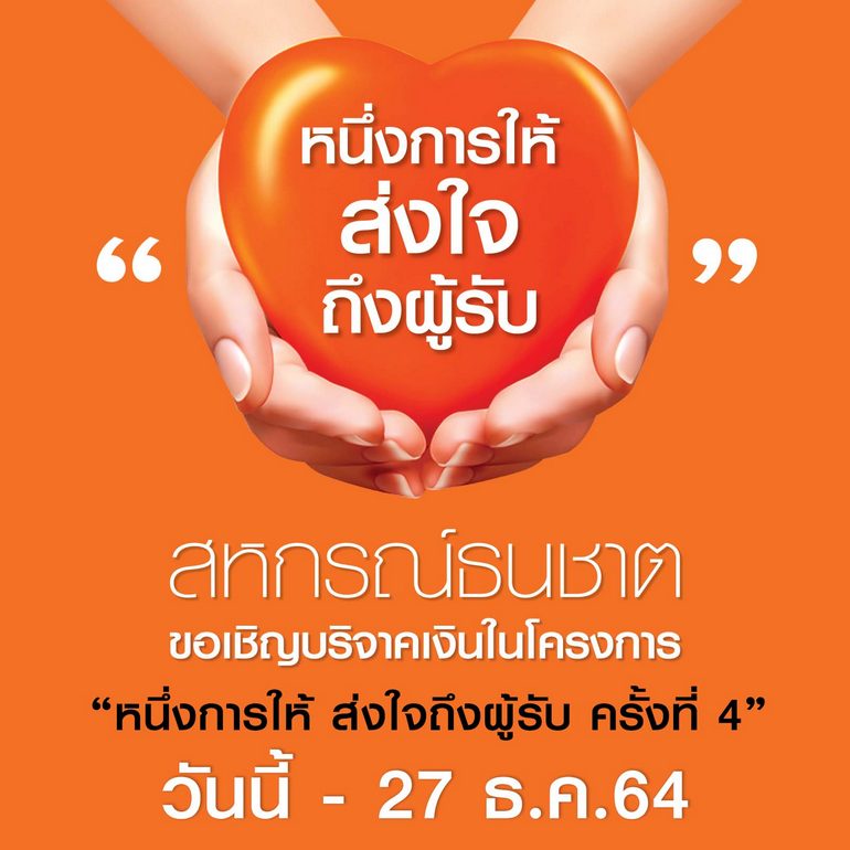 เนื่องในโอกาสส่งท้ายปีเก่า ต้อนรับปีใหม่ ขอเชิญสมาชิกทุกท่าน ร่วมบริจาคเงินเพื่อแบ่งปันสิ่งดี ๆ ให้กับสังคม ในโครงการ “หนึ่งการให้ ส่งใจถึงผู้รับ ครั้งที่ 4” วันนี้ – 27 ธ.ค. 64