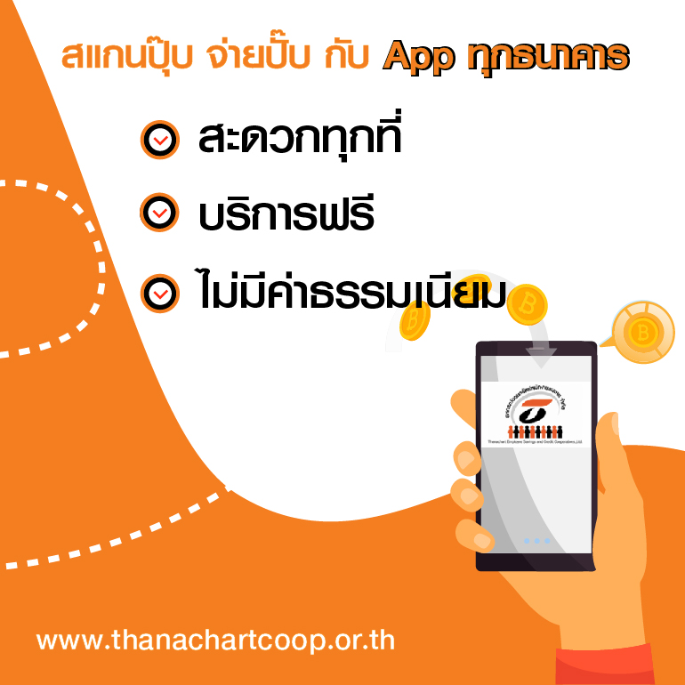 สหกรณ์พร้อมให้บริการโดยเพิ่มความสะดวกในการจ่ายบิลมากยิ่งขึ้น ด้วยระบบสแกน QR Code เพื่อนำไปชำระบิลผ่าน App ทุกธนาคาร ไม่ว่าจะชำระเงินกู้ , ฝากเงิน หรือชำระค่าหุ้นโดยไม่เสียค่าธรรมเนียม