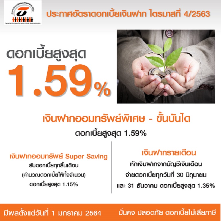 สหกรณ์ธนชาต เปิดรับฝากเงิน รอบไตรมาสที่ 1/2564 ดอกเบี้ยสูงสุด 1.59% วันนี้ – 31 ธ.ค. 63